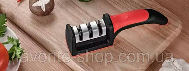 Точило являє собою пристосування для заточування та виправлення ножів у три етапи: від грубого виправлення до ідеального заточування. Корпус із міцного пластику із силіконовим покриттям та елементами з неіржавкої сталі. Завдяки нековзній гумовій і зручній ручці, ця стругачка для кухонних ножів дуже зручна та безпечна.Совмісна форма й обтічний дизайн забезпечують бездоганний зовнішній вигляд. Основа виготовлена з нековзного матеріалу, що гарантує безпеку та стійкість.